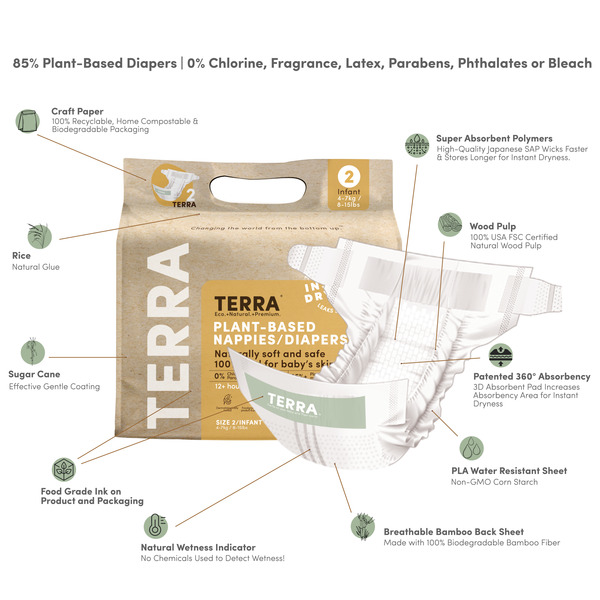 TERRA Infant Diapers are thoughtfully designed to keep your growing baby snug, dry, and smiling through every nap and cuddle. TERRA Diapers are soft, breathable, and ultra-absorbent, keeping your infant dry and comfortable through longer sleeps and active days. Made with safe, plant-based materials and dermatologically tested for sensitive skin, they provide care as gentle as your touch.